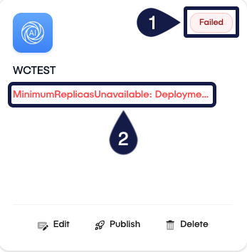 If your publish fails, it will shown a red message in the body of the AI Agent card witht the mains reason (1). By hovering this message, you will see more details about the error. Also, GlobalAI flags your AI Agent as Failed in the status badge (2).